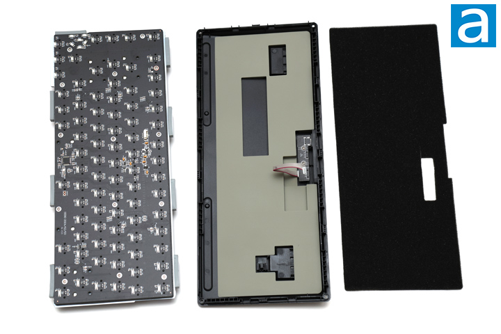 In between the plate and the PCB, there are several layers of sound damping material, including a latex sandwich foam and a thinner IXPE switch pad. This helps by providing a deeper tone to the sound and reducing unwanted noise. They also contribute to a softer bottoming out sound and feel. Otherwise, you can see the cluster of LED lights above the right arrow key.