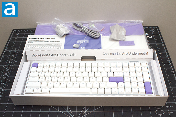 Out of the box, you will receive the Epomaker Luma100 keyboard with a cable, extra switches, additional feet, carrying case, and a user manual. The keyboard is wrapped in plastic to prevent any surface scratches. I was satisfied when it came to packaging. The quality of the packaging was good, but could benefit from the use of foam.