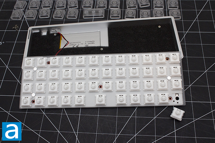 The disassembly process of the Epomaker Luma40 is quite simple. I started by taking off all the keycaps, as the screws can be found underneath them. This is true for all tray mounted keyboards. After removing the keycaps, you will now have access to the screws. Upon removing the screws, I pulled out the PCB enclosure out of the case. This disassembly process was quite familiar with many other tray mount cases I have worked with. It was a good experience to take apart. Upon exposing the interior, I was satisfied with the design. As this is a wireless keyboard, there is a nice cutout for the 1450mAh battery.