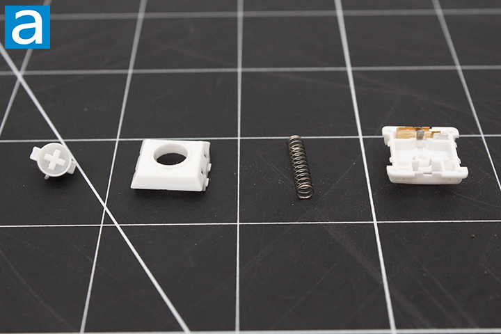 Upon closer inspection of the Kailh White Rain switches, I hope to provide you with more detail in the makeup of the switch. For the White Rain switches, the whole switch is made from polyoxymethylene, or POM for short. POM is known for its high stiffness, low friction, and excellent strength. Specifically, this material has a coefficient of friction of around 0.25 to 0.3, which is low when you consider this is a measurement on a 0 to 1 scale. As such, you can see why POM is so commonly used in switches. This switch is designed as a low-profile switch. This means the total travel is quite limited, being 2.8mm compared to the typical 4mm. The typing experience did not feel bad, even when comparing it to a regular mechanical switch. You may need to get used to the shorter travel as it is quite significant. The spring has an average length of 15.5mm.
