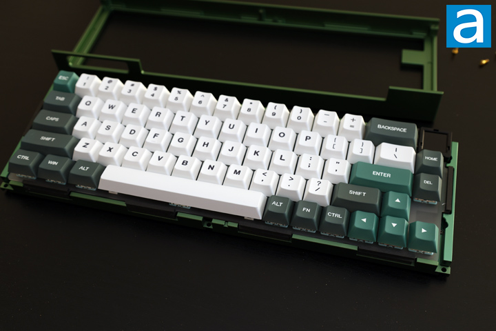 Like the Epomaker P75, the MS68 is extremely easy to take apart. With the included hex key or your own hex screwdriver, you can remove a total of five screws from the bottom. Once you do so, the top and bottom separate, revealing the inner contents. From this angle, there are multiple things to note. First, all the switches sit on top of a flex-cut polycarbonate plate. The whole keyboard deck sits in valleys all around the keyboard. Black foam pieces exist in these valleys to cushion and reduce any resonance, but this also explains why there was so much flexing when pressed. The deck sits in place as the top and bottom aluminum enclosures clamp down on these edges. These foam gaskets should reduce vibrations and any unwanted movement transferring to the rest of the shell.