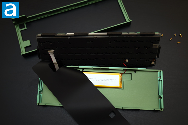 In addition to the battery and connection board, there is a porous sound absorption foam and a dense EVA case foam underneath the printed circuit board. In total, we have five added layers to the keyboard deck and the PCB, which is quite impressive to see how much they have sandwiched into this enclosure. The other thing to note is just how sturdy the metal shell is, as there is no bending or torquing the two pieces.