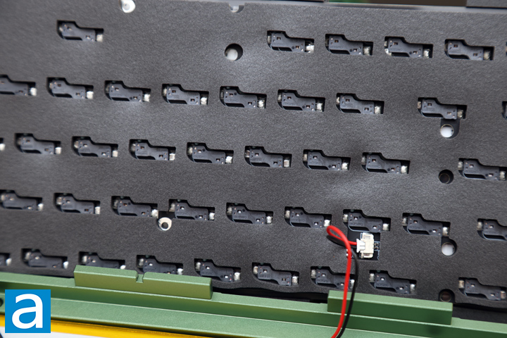 In between the plate and the PCB, there are several layers of sound dampening material, including a thicker sandwich foam, a thin plastic layer, followed by another thin layer of switch foam. These deal with multiple problems including stabilizing the stabilizers and reducing unwanted noise. They also provide a softer feel in each keystroke when bottoming out.