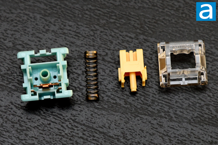 The Epomaker Sea Salt Silent switches are in a neat combination of colors, matching a sandy yellow stem with a blue base and a clear upper housing. After you open the switch, there are a few things to take note of. The top clear shell is polycarbonate, while the bottom blue material is nylon. In between, we have a yellow polyoxymethylene, or POM, plastic stem. The stem does have an MX design with a box around it to provide a bit more stability for the keys. Epomaker says this switch should be compatible with MX structure keycaps. It might be strange to see a combination of plastics used here, but there are benefits for each different type. For example, polycarbonate is strong and hard, which should keep the switch housing durable to multiple swaps. POM is beneficial to use, as it has a high resistance to abrasion and strength while maintaining a low coefficient of friction, resulting in an overall smooth travel. Altogether, we should have a consistently quiet output when bottoming out. The metal spring inside is 15mm long. There is minimal stem movement from side-to-side or forward-and-back, which is good to see. Otherwise, everything inside is factory lubricated to keep movement smooth for longer.