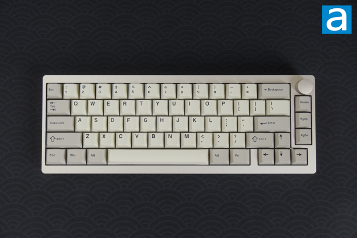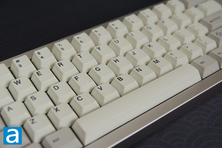 The keycaps are made with PBT double-shot plastic. PBT plastic resists wear and shine compared to ABS plastic. It typically has a lower pitched typing sound. The double-shot black colored legends will never fade, as they are molded with a different color plastic underneath the keys. The legends are clear and mostly crisp looking. Some of the keys do have slightly inconsistent thickness in the lettering, which is not ideal. It could suggest a less accurate or worn-out plastic injection mold. The alphanumeric keys are in an off-white color reminiscent of old personal computers, while the modifier keys are in a light gray color. The keycaps are sculpted in the Cherry-profile, and has the North American QWERTY ANSI layout. They feel solid and have good quality at this price point. For those who want to personalize the keyboard with their own keycaps, there is a non-standard 1.75U right Shift, 6.25U space bar, and 1.25U bottom row modifiers. The navigation keys featured are Delete, Page Up, and Page Down on the right side.