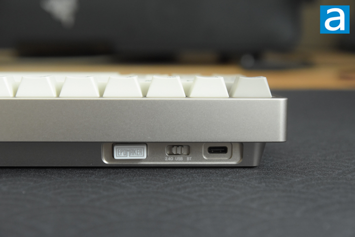 Looking around the sides of the keyboard, the front edge is flat and plain with the top case visible. On the sides, there is minimal sculpting at the rear of the base providing a little bit of artistic flare. The back side of the keyboard is where more business is happening. When viewing from the back, the right-most side has a USB Type-C port for wired connectivity. Left of the port is the tri-mode connectivity switch. It can be set to Bluetooth, wired, or 2.4GHz modes. Beside the switch is a magnetic slot for the wireless 2.4GHz USB Type-A dongle.