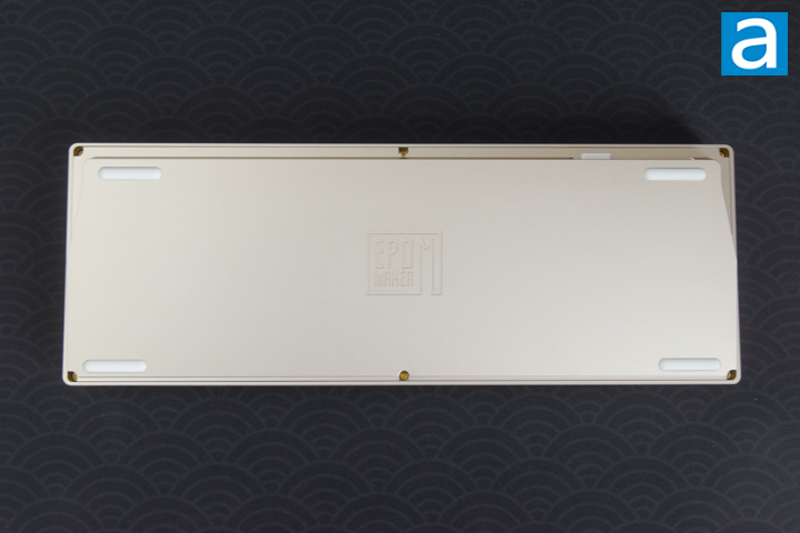 On the bottom of the keyboard, the Epomaker logo is engraved in the center and looks sharp. Four pill-shaped rubber feet are laid horizontally on each corner. Along the edges are six inset holes that have golden-colored 2mm hex screws that hold the keyboard together. There are no kickstand feet on the Epomaker P65, so what you see is what you get in terms of height.