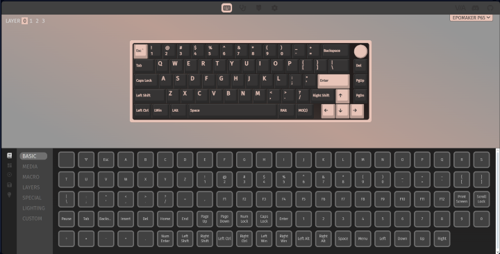 Rather than using proprietary software to customize keyboard functionality, the Epomaker P65 is programmed through QMK/VIA. For most users, VIA will be the easiest to use, as it is a web-based graphical user interface that allows users to modify what the keys do. Unfortunately, the Epomaker P65 is not immediately recognized by VIA, and requires the use of a .JSON file that can be found on Epomaker’s website. Personally, I like the use of QMK and VIA, as this allows users to deeply customize their keyboard. VIA support allows users to quickly and easily program their keyboard without installing vendor-specific software. The downsides are perhaps the elevated complexity of figuring how to configure the keyboard to their liking. For the most part, VIA is straightforward in dragging and dropping the desired key on the displayed keyboard, but more special settings will take a bit of learning.