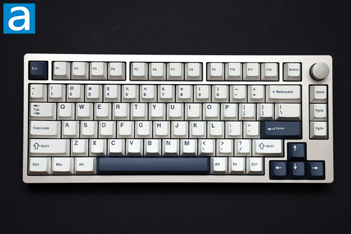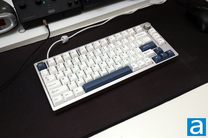 The Epomaker P75 is a simple looking keyboard from first glance. It uses a traditional look with a frame around the border of the keyboard. It has a rectangular footprint with curved corners. The edges are still 90 degrees. The whole keyboard is quite bright with its mostly white keycaps. The navy-blue accents on the Escape, Enter, space bar, and arrow key cluster offer a neat bit of contrast, complementing the blue font found on the other keycaps. The borders are light grey with a matte anodized finish and do not hold any handling marks or smudges. Better yet, this is made of aluminum, which offers a nice cool touch whenever you touch the P75. The top right side has a volume knob made with the same material and color. Overall, I really like how simple and no-nonsense the Epomaker P75 is. In addition to this silver color, you can also get the P75 in a black and pink color combination.