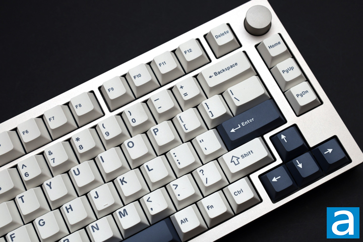 The layout of our Epomaker P75 is standard for North America with its QWERTY ANSI layout. We have a total of eighty-one keys, which is typical for a 75% size. The layout is easy to adjust to, as most of the keys are where you would expect. The primary differences come on the right side of the P75. Unlike a tenkeyless keyboard, we do not have a standard cluster of keys above the arrow keys. Instead, those keys are in one column, with one more overflowing to the top row and the rest relegated to secondary function status. We also have a volume knob. Due to the squished arrow key cluster, the left Ctrl, Alt, and Windows key are standard 1.25U sizing, but the right Alt, Fn, and Ctrl are just 1U. The right Shift key is also slightly shorter. Personally, the main difference was getting used to the Delete being above backspace rather than to the right of it. There are no dedicated LED indicator lights. Instead, the Caps Lock and Windows key both illuminate white when you do press for their respective locks.