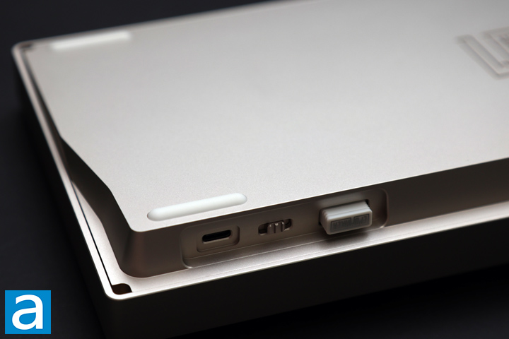 At the back left side, we have three items here, which are all used to connect the Epomaker P75. Starting on the far edge, we have a USB Type-C port opening to connect or charge the Epomaker P75. Next, we have a three-position switch to change the connection mode. In the middle, the keyboard is powered off but functions over a direct wired connection. Pulling the switch towards the USB port changes to Bluetooth mode, where you can connect to three different devices. This reports at a polling rate of 125Hz, which is typical for Bluetooth and keeping the battery draw low. On the other side, we have the capability to connect over the included USB transmitter. The P75 has a carved-out spot where the USB transmitter can sit in when it is not in use with a small magnet inside to keep the transmitter from flying out. Over wired or the USB transmission, the Epomaker P75 reports at a 1000Hz rate. I did not notice any lag when using the P75 over USB, whether wired or wireless, but there was some perceived lag over Bluetooth.