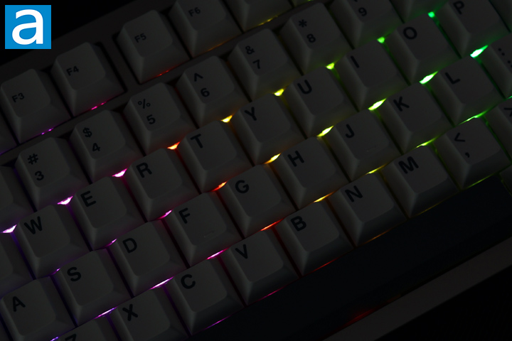 On the other hand, the RGB lighting situation is not the best on the Epomaker P75. Due to the solid keycaps with no light passthrough, the lighting acts more as an underglow rather than illuminating each key. In the dark, you will not be able to see your keys, unlike most gaming keyboards. The south-facing lights do shine around the keycap and at least are more visible to the user, but not through the legends. As for its effects, we have all the standard options, such as rainbow mode and various static and reactive options. At maximum brightness, the lights are somewhat vibrant, but the fact it only glows around each key means users may end up turning off this lighting, especially to increase battery life. Lighting controls can be adjusted using secondary functions on the Epomaker P75. The up and down arrows control brightness, while the left and right arrows cycle through backlight modes. The right square bracket, or "]", is used to cycle through backlight colors, while the backslash, or "\", is used to cycle through lighting effects. Finally, you can turn the lights off by turning the brightness to zero or using Fn+Backspace. You can also change these settings in the software.