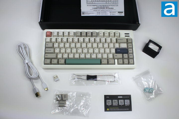 Inside the box you will find the RT82 Keyboard along with a trio of alternate keycaps for MAC, a keycap/switch puller, a multilingual user manual, a 2.4G receiver, a USB Type-A to USB Type-C cable, a card with QR codes for VIA and other relevant software/support sites, two extra switches, and the detachable mini display.