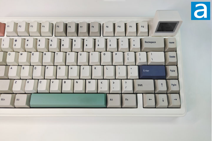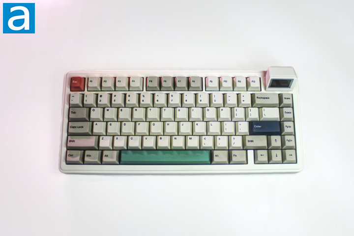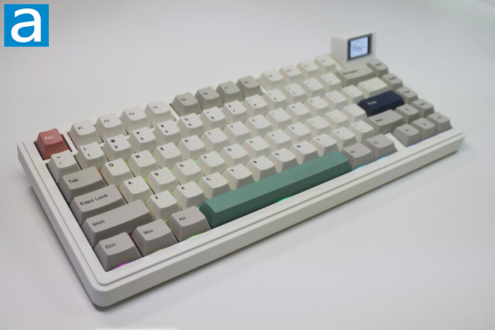 The Retro White colorway is a simple but well-executed design; the combination of off-white and light grey keycaps emphasizes the south-facing RGB LEDs, while the space bar, enter key, and escape key accent the color scheme in green, blue, and red, respectively. For this keyboard Epomaker has chosen a solid color ABS plastic case with dye-sub PBT keycaps. In my opinion, the colors chosen for the case and keycaps mesh to create a cohesive aesthetic. The keycaps on the RT82 feature a standard high-bezel design with a Cherry profile. The dual two-stage kickstands feel sturdy and click firmly into place; I have not encountered any issues with sliding during my time with this keyboard. The novelty of the RT82 is, of course, the detachable mini display. The display clicks into place using magnets to ensure proper contact and turns on without any further hassle. The LCD screen is plastic, and therefore more susceptible to damage than glass, a consideration that must be made before purchase.