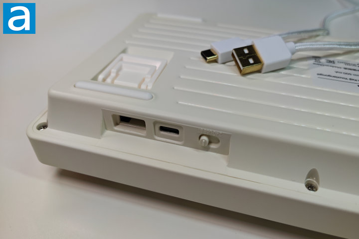 The Epomaker RT82 has three available routes of connectivity: Bluetooth, a 2.4Ghz Wireless Receiver, and a 6-foot USB Type-A to USB type-C cable. The RT82 has a switch on the back left rear that can be used to select which method of connection you wish to use. While reviewing this keyboard, I have used all three options and found them to work without hassle. The wired USB connection is the fasted, as would be expected, providing 1000hz, with 3ms of latency. The included cable connects to the keyboard using a USB Type-C port located on the back left side. This braided cable is a pleasant white and can be used to charge the keyboard or to download .gif files for the mini display. This process will be discussed shortly in the software section of the review. The 2.4Ghz wireless receiver is the middle choice of the three, and personally the one I found the most convenient. The receiver still offers a connection with the same 1000hz as the wired alternative, but with slightly increased latency at 5ms. Finally, the Bluetooth connection is the weakest option, with only 125hz, and a much higher 15ms of latency. I tested this with several devices and did not encounter any difficulty with connection or compatibility. I tested this feature with Android mobile devices and a Windows laptop and found the connection process painless. The branding on the Epomaker RT82 is present but discrete. The only branding consists of a silver badge on the back of the mini display (where you will never see it while typing), and an Epomaker brand name printed on the 2.4Ghz receiver. I appreciate the very subtle branding, since I typically don’t find myself forgetting which brands I use.