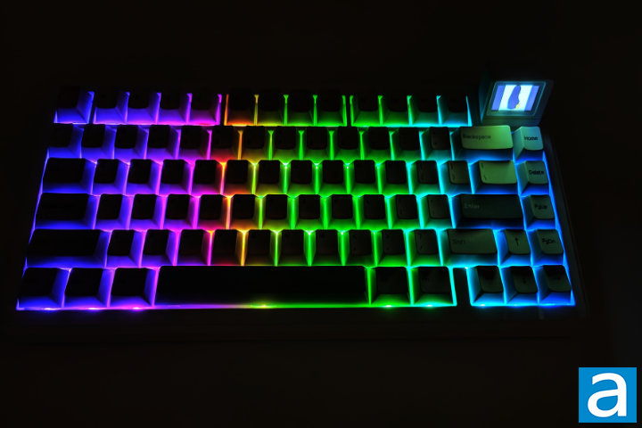 Last but not least, there are keys assigned to controlling the lighting effects. Backspace will turn the lighting effects on/off, while the Backslash key will toggle the lighting effects. For brightness control, we can use the vertical arrow keys, and with the horizontal arrows control the speed of the lighting effect. The bracket keys can be used to adjust the hue of the backlight, while the semicolon and quote keys adjust the saturation. The RGB LEDs under the keycaps are south-facing, providing a pleasant, even glow, and ensuring compatibility with Cherry profile keycaps. The effects and colors produced by the backlight are highly customizable through VIA, which will be discussed later in this review.