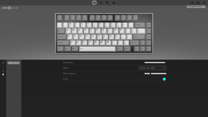 The lighting color can be chosen from a color picker interface or chosen with a specific hexadecimal color code. For color accuracy, the RT82 excels at matching selected green-blue hues but struggles significantly at matching colors with orange, red, or magenta hues, especially when the saturation is anything short of the maximum. When the saturation is reduced significantly, all colors merge into a light cyan color, and moving the slider between hues on the color picker interface does not change the color produced by the keyboard. Ironically this light cyan color is actually what I ended up leaving as the color for the keyboard, as I found it to be a very pleasing color. Effects can be chosen through VIA from a drop-down list of 45 options, including several reactive effects. The speed and color can be altered using the function key combinations as discussed earlier when VIA is not open, or in VIA using the sliders. Overall, I found the VIA software experience with this keyboard to be intuitive and relatively painless.