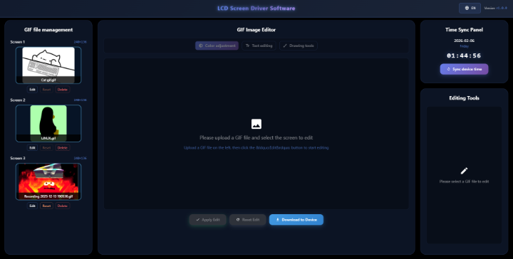 The next software, LCD Screen Driver Software, is used to control and customize the mini display. I found this intuitive to use, with a drag-and-drop file upload system. The files used must be in .gif format to be compatible with this software. After uploading a .gif file, you can choose to edit it, with options for color adjustment, text editing, or even markup drawing tools. These are easy to use and are clearly labeled. After any desired edits are made and applied, they can be downloaded to the RT82 and cycled through using FN+Shift. The DIY GIF mode can be accessed using FN+Enter.