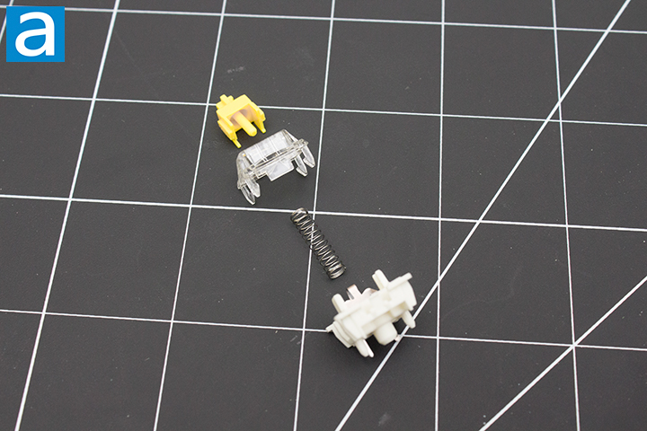 Upon closer inspection of the Gateron Yellow switches, I hope to provide you with more detail in the makeup of the switch. It is important to note Gateron has many offerings of Yellow switches. Our specific model seems to be the KS-9 model, otherwise known as Pro Yellows. This differentiation is important, as the material makeups are different between models. For our model, the top housing is polycarbonate, the bottom housing is nylon, and the stem is polyoxymethylene, or POM for short. POM is known for its high stiffness, low friction, and excellent strength. Specifically, this material has a coefficient of friction of around 0.25 to 0.3, which is low when you consider this is measured on a 0 to 1 scale. As such, you can see why you would want a switch stem to be made out of POM. This stem would be considered a regular pole stem, which results in a standard bottom out distance. As for the top housing, polycarbonate is a very commonly used thermoplastic in mechanical keyboards. It is commonly used for translucent switches, which is important for light to shine through. The bottom housing uses nylon, which is also quite smooth with a coefficient of friction of about 0.26. I do find nylon offers a deeper pitched sound when it comes to bottoming out. The spring is quite average at 15mm. The operating force required to actuate the switch is about 50g.
