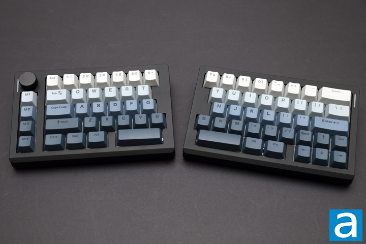 Our Epomaker Split70 keyboard comes in a modified North American QWERTY ANSI layout. This results in a total of seventy-one keys and a volume knob. As the keyboard divides into two, there are many changes here. Starting from the top row, the Escape key is now where the backtick/tilde key would normally be. The backtick is instead on the right side beside Backspace. To accommodate this move, all the numbers on the right side are shifted from one spot to the left. On the fourth row down, we have a pair of "B" keys, with one on each side, so users can press it with either hand. This is typical for split keyboards since "B" is in the middle. The right Shift key is squished into a single 1U key to fit the arrow cluster here. A Delete key is also located to the right of the Up arrow. On the bottom row, the left side has standard 1.25U keys for Left Ctrl, Windows, and Alt. The space bar is half its size. On the right, we have another half space bar, followed by 1.25U Right Alt and Fn. Finally, there is a column of macro keys on the left side, in addition to a volume knob at the top.