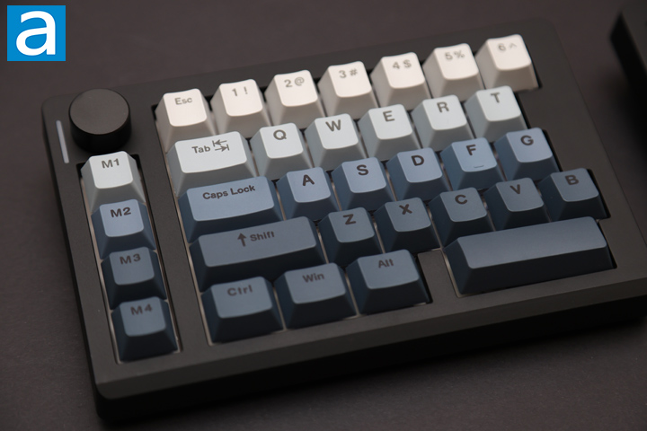 On the table, the Epomaker Split70 fits in the gray XTracGear Carbonic XXL. In terms of layout, the keyboard was difficult to get used to. First, the number row being shifted over on the right side means they are different from my muscle memory. I ended up remapping the top row and put the backtick key in the center. Secondly, the right Shift only 1U sized means I accidentally hit the Up arrow often. The Delete key placement and missing right Ctrl is also a bit less than ideal, but it comes with the territory of the size. The volume knob is nice to have for quick adjustments, as are the four macro keys down the side. I am grateful for the ability to remap keys, but I do not think Epomaker should have changed the number row in the first place.