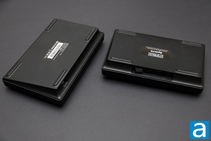 The bottom of the Epomaker Split70 has basically nothing to look at. In the middle of both are differing labels. The left side has just the product name and description, while the right side has certification and other product information. It also notes the keyboard is made in China. The corners have rubber pads to keep the keyboard in place. Unfortunately, there are no kickstands to prop up the keyboard either at the back or to tent the keyboard, which could help with better ergonomics. The only other thing of interest is located on the back edge of both sides. The left side has a holder for a USB dongle, switch to choose between the three operation modes, and a USB Type-C port to connect the keyboard to the computer. There is one more USB Type-C port to connect between the left and right sides. To get the whole keyboard operating, you do need to connect both sides to each other.