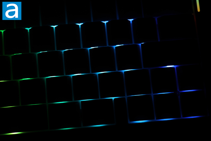 As we have seen from many PBT keycaps, the lighting solution on the Epomaker Split70 is like an underglow, as the light does not shine through. The backplate under the keys is white, which disperses the lighting. Even still, in the dark, you will not see the legends of the keys. The south-facing lights shine around the keycap and are a bit more visible than the alternative north-facing orientation. At maximum brightness, the lights are nice to see and bleed through between the keycaps, even if our photos do not capture it well. Other areas of illumination include a pair of the diffusing bars on the sides of the Split70 for some more color.
