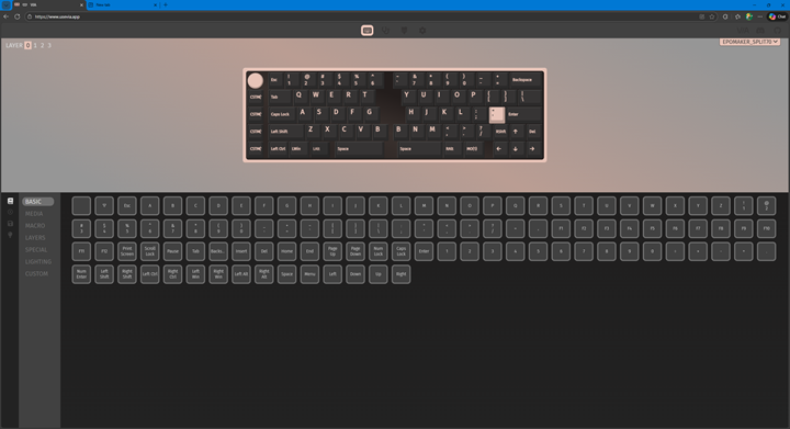 Epomaker does not make software directly for the Split70, but instead works with VIA. As you have seen from previous reviews, VIA is an open-source keyboard software that has wide support for many different keyboards. While you could download VIA to use on your system, you can also use their web-based application. I tested this on Microsoft Edge, but it should work on other Chromium-based browsers like Google Chrome or Opera. For those who are not familiar with it, VIA has four primary tabs of Configure, Key Tester, Design, and Settings. To get the Split70 recognized with VIA, you will need to upload a JSON file, which can be found on Epomaker's website.