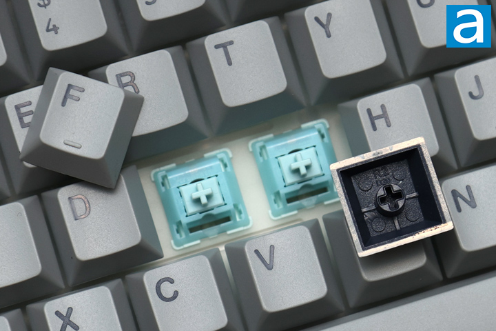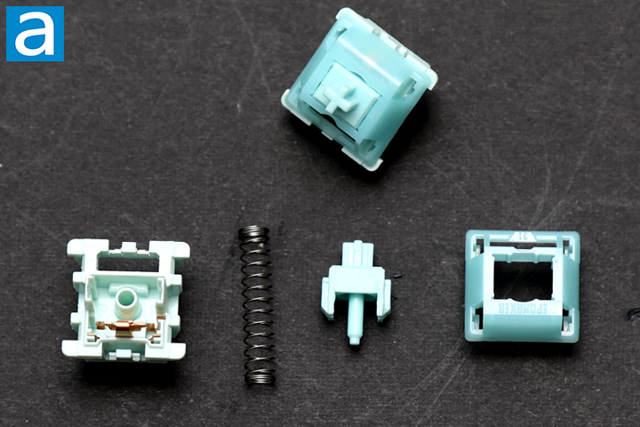 Taking a closer look at the Epomaker Creamy Jade switch, it has a blue top and light green and blue bottom. A stem is in the middle with a 20mm spring that keeps the switch elevated. The switch stem has minimal lateral movement inside the housing, which ensures actuation is stable and the keys do not wobble about. The switches are factory lubricated for a smoother typing feel and sound. The stem is made of polyketone, or POK plastic, which is said to offer better wear resistance to traditional POM stems. The upper case is polycarbonate, while the bottom one is PA66, which refers to polyamide or nylon 66. The contact pins are a combination copper and palladium alloy.