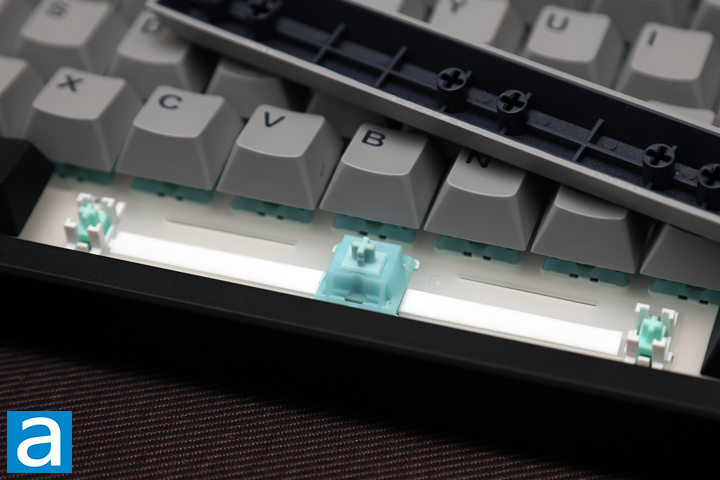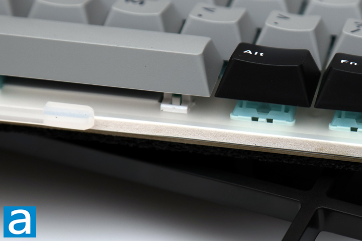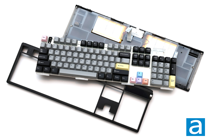 The keyboard deck sits in here with gasket mounts in between the top and bottom shell. There are eight protrusions around the deck with rubber mounts to hold in place. These gaskets should also reduce vibration or unwanted movement transferring from the deck to the rest of the enclosure. Underneath the deck, there is a thick layer of silicone to fill in the gaps of the bottom shell. It also works as an insulator for the two large batteries underneath and the daughterboard. The two batteries add up to 10000mAh, which ensures a long battery life.