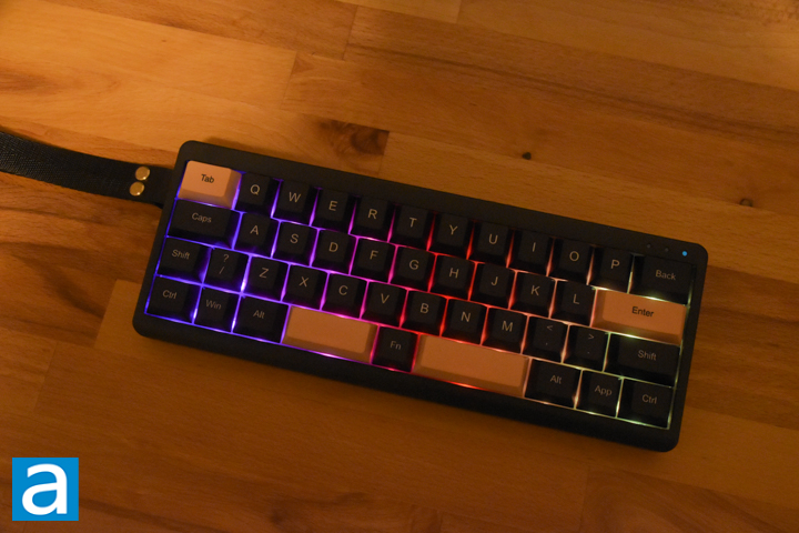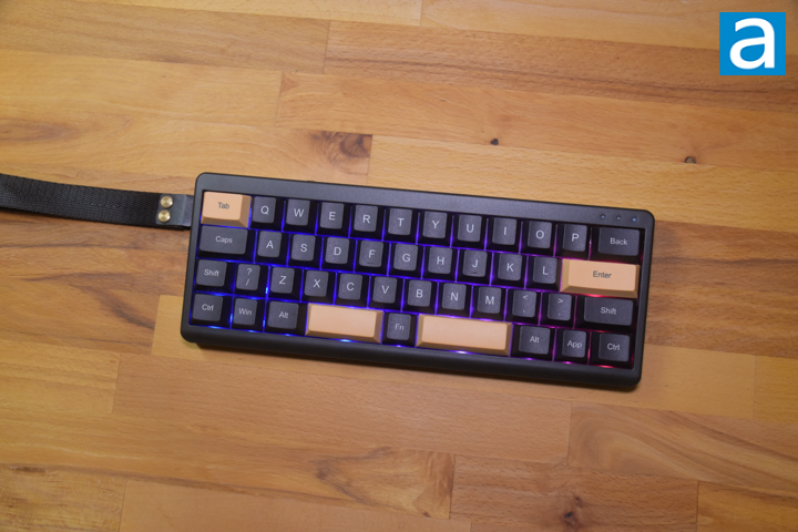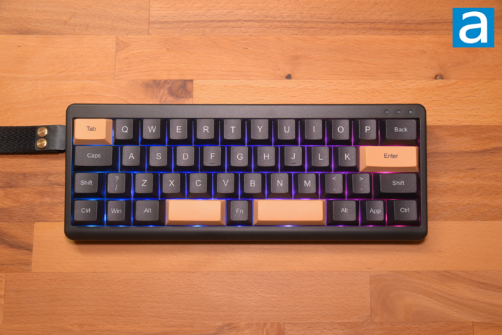 The layout of the TH40 strays from that of most standard keyboards. As it is a 40% layout, many of the modifier keys are differently sized. The '?' key has been relocated to the bottom left, and the number row has completely disappeared. Many missing functions need to be accessed via the 'Fn' key in conjunction with the remaining keys. The space bar has been split into two, with the 'Fn' key wedged in the middle. The design of the keyboard is very compact, measuring 258mm wide, 97mm deep, and 35mm tall. If portability was a top priority, this keyboard would rank pretty high. The case of the keyboard is made of black plastic, with gold appearing only on the space bar, Enter, and Tab keys. Despite the all-plastic construction, it feels fairly solid with limited flex, and weighs 0.5kg.
