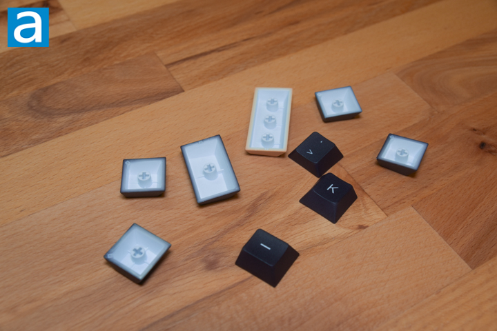 The keycaps are Cherry profile, which are my personal favorite. The keycaps are made out of PBT plastic, which offers good wear and shine resistance compared to ABS plastic. The legends are printed with dye-sublimation, which are essentially baked into the plastic and are quite durable unlike laser printing or silk screen, but not as premium as double-shot injection molding. Unfortunately, the legends have inconsistent centering, with some slightly shifted right. The design of the legends also looks like they should be perfectly centered, making the keycaps look cheap. The original color of the keycaps is white, with ink applied on the top and sides of the keycap to produce the black and gold colors. There are quite a few non-standard sized keycaps to be aware of. The backspace is 1.5U, right shift is 1.75U, left shift is 1.25U, left space bar is 2.25U, and right space bar is 2.5U. Finding aftermarket keycap sets to fit this keyboard may be more difficult or expensive.