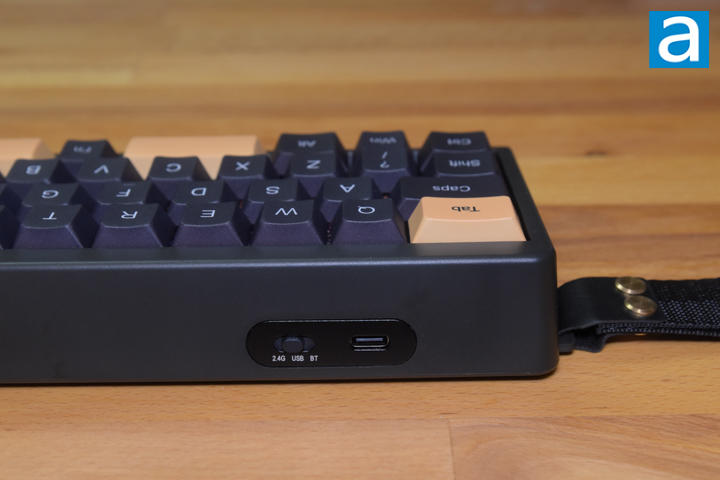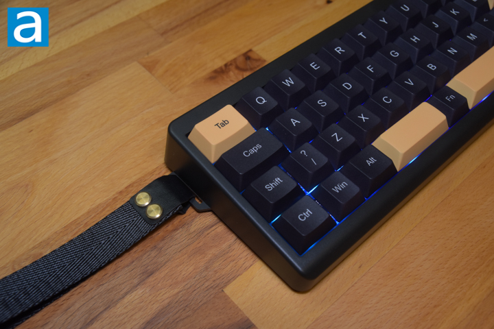 There are three indicator lights on the top-left edge of the keyboard, showing Caps Lock, Win Lock, and wireless connectivity, from left to right, respectively. The flip-out feet on the bottom can further elevate the typing angle. Perhaps the most curious design choice is the removable carry strap attached to the left side of the keyboard. There is a small plastic bar to which the strap attaches. The strap itself has a faux-leather anchor with brass screw rivets, while the rest of the loop is made from a seatbelt-like material.