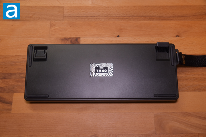 The bottom of the TH40 has two single stage flip out feet to adjust for the typing angle. The front has two long horizontal silicone feet, and the back has two vertically oriented feet. A shiny silver label with Epomaker and TH40 branding is found dead center. No screw holes are visible on the keyboard, and I was unable to find an easy access point into the internals of the keyboard.