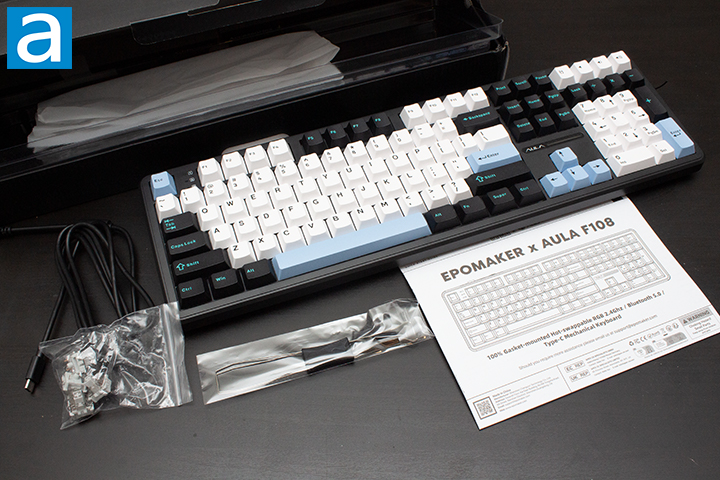 Out of the box, you will receive the Epomaker x AULA F108 keyboard with a cable, keycap/switch puller, extra switches, and a user manual. The keyboard is wrapped in plastic alongside a plastic cover to prevent any surface scratches. I was pleasantly surprised when it came to packaging. The quality of the packaging is quite standard for many other manufacturers.
