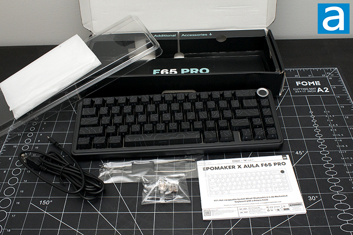 Out of the box, you will receive the Epomaker x AULA F65 Pro keyboard with a cable, keycap/switch puller, extra switches, and a user manual. The keyboard is wrapped in plastic alongside a plastic cover to prevent any surface scratches. I was pleasantly surprised when it came to packaging. The quality of the packaging is quite standard to many other manufacturers.