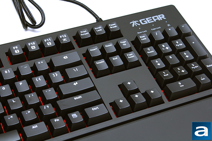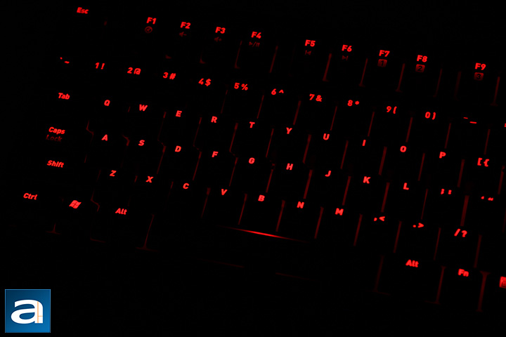 Once you turn off the lights and activate the Fnatic Gear Rush G1's backlit keys, the keyboard really shines -- no pun intended. If you look closely, the font of the key labels has been changed from the Func KB-460; the Fnatic version is a little bit bolder. The Rush G1 features full key backlighting, but in only one color, and that is red. Backlight intensity can be adjusted on the fly by hitting the Function key along with the labeled '8' and '2' buttons on the number pad to increase or decrease the level, respectively. The backlight can be turned off completely, or activated in three different brightness levels. If you increase the brightness to maximum, and increment it up once more, the Fnatic Gear Rush G1 will enter into a special backlight mode, where the backlight will fade in and fade out continuously. I am a big fan of fully backlit keyboards, and I am happy Fnatic Gear designed the Rush G1 with this feature. On the other hand, while I do not expect SteelSeries Apex M800 kind of light show, a few more user configurable color options would be nice. My primary concern is red light is the most attention grabbing color, so some users may find the Rush G1 particularly distracting at night. Obviously, you can turn off the backlight at night, but what is the point?