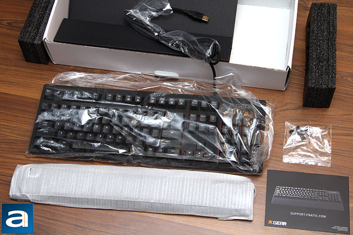 As with other keyboards in the RUSH gaming keyboard lineup, out of the box, you will receive everything you will need and nothing more. Securely clipped between two Styrofoam brackets is the Fnatic Gear RUSH Pro Silent keyboard itself contained in a clear plastic bag, while its detachable wrist rest is wrapped inside a separate piece of white foam. Two plastic clips used to attach the wrist rest to the keyboard are located inside a resealable plastic bag; more on this later. On the product literature side, a quick start guide is included. A driver CD is nowhere to be found, but this is okay. If you do not have internet, as always, please send me an email, and let me know how you came across this review, haha.