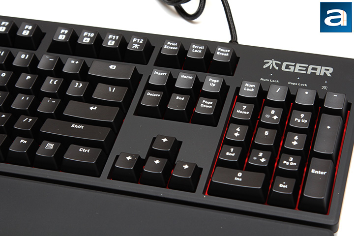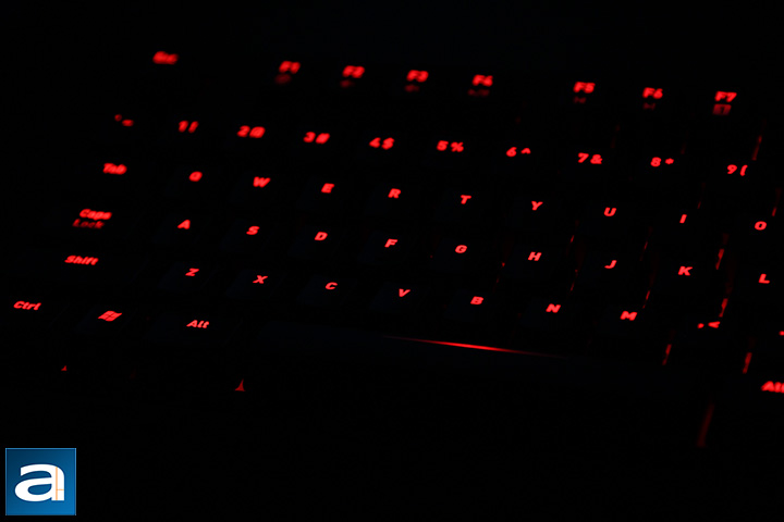 Once you turn off the lights and activate the Fnatic Gear RUSH Pro Silent's backlit keys, the keyboard really shines -- no pun intended. If you look closely, the font of the key labels has been changed from the Func KB-460; the Fnatic version is a little bit bolder. The RUSH Pro features full key backlighting, but in only one color, and that is red. Backlight intensity can be adjusted on the fly by hitting the Function key along with the labeled '8' and '2' buttons on the number pad to increase or decrease the level, respectively. The backlight can be turned off completely, or activated in three different brightness levels. If you increase the brightness to maximum, and increment it up once more, the Fnatic Gear RUSH Pro Silent will enter into a special backlight mode, where the backlight will fade in and fade out continuously. I am a big fan of fully backlit keyboards, and I am happy Fnatic Gear designed the RUSH Pro Silent with this feature. On the other hand, while I do not expect SteelSeries Apex M800 kind of light show, a few more user configurable color options would be nice. My primary concern is red light is the most attention grabbing color, so some users may find the RUSH Pro Silent particularly distracting at night. Obviously, you can turn off the backlight at night, but what is the point?