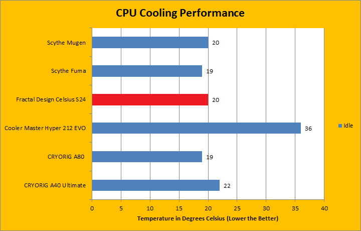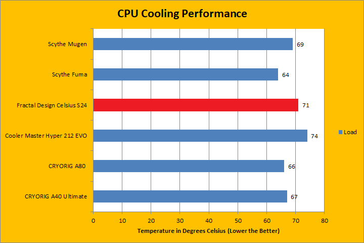 There are a few other water coolers and air coolers on this list to have a proper comparison, while as many variables as possible were kept constant. The only 280 mm cooler on the list is the CRYORIG A80, while there are quite large air coolers on the list as well, with one that is a bit smaller. They should give good references for comparison. The Fractal Design Celsius S24 was mounted to the front of the case with both fans attached in a push configuration. The temperature results for each cooler was measured with CoreTemp, which reports the CPU's integrated digital thermal sensor for maximum accuracy. Each temperature result was calculated by taking the maximum value of the cores inside the CPU.