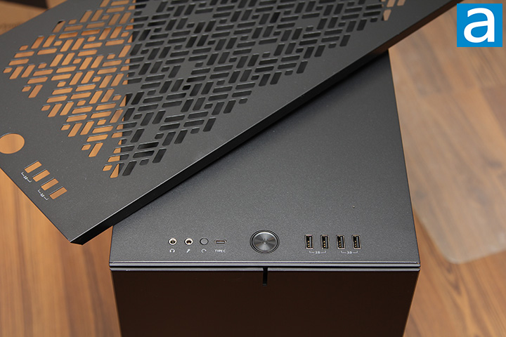 Rather than setting the front panel connectors behind the door, Fractal Design made a wise choice in putting them at the top of the Define 7, just like every model that came before it. The Define 7's layout configuration is very similar to its predecessors. With its power button placed nice and center, the designers managed to create a level of symmetry in an asymmetric fashion. On the right side of the power button, we have two USB 2.0 ports and two USB 3.1 Type-A ports. Both sets are clearly labeled. On the left side of the power button, there are two 3.5mm audio jacks for headphone out and microphone in, reset button, and a USB 3.1 Type-C port. I think it is better to have the reset button behind the front door, but at least it is still hard to press accidentally. Surrounding the power button is a stylish white LED ring. The power LED is also visible via a slit from the front in classic Fractal Design fashion. It no longer doubles as a drive activity light though.