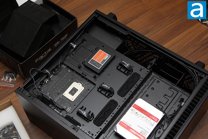 The rest of the installation process came and went just as smoothly as I continued to install the rest of my components like the Fractal Design Ion+ 760W. The placement of the Nexus+ 2 fan hub to the top of the case as a strip was a great design choice in my opinion. Meanwhile, HDD and SSD installation was extremely simple as well; simply align it with the proper holes at the bottom of each drive tray and attach four screws. The main trays as well as the Multibracket can accommodate both 2.5" and 3.5" drives, as discussed earlier in this review. After all the necessary screws are attached, place it in where it belong, make the proper connections, and you are good to go. A Western Digital Red Pro WD141KFGX 14TB is installed on the Multibracket. The only inconvenience I have encountered during installation was the Multibracket in the configuration shown in the photo is that it cannot be removed without taking the cover out on the other side. However, the cover can only be taken out if you remove both fans, which adds quite a bit more work. You can install your SSDs at the back of your motherboard as well, as shown in our photo above.