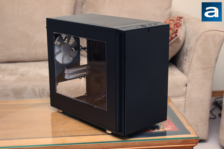 The front panel features a nice brushed metal-like look, just like its older brother, but it is still plastic here. The side panels are made out of some sort of ferrous metal, which is probably steel. They have a nice surface with only a small amount of grit to make the panels easy to hold. The left side panel also has a relatively big side window, revealing all internally to the user. This does mean you should be more careful in your cable management, but we will look more into this during our installation. At the top, there is the front I/O connectors; exactly in the same location as the Define S. In addition, like the Define S, the Nano S has very little Fractal Design branding. While you may think this sacrifices brand recognition, I think Fractal Design is one of the few manufacturers who place a higher priority on simplicity rather than just getting people to know who they are. I commend all companies who remove their logos for a cleaner look, and Fractal Design is no different. Otherwise, the rest of the case follows the same black look you see today. In addition to the windowed version, a non-window Nano S is also available.