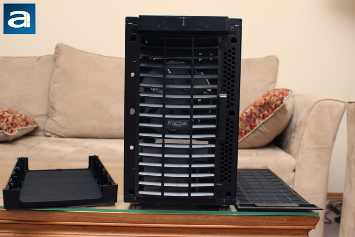 Taking off the front panel, and you can see Fractal Design has done some interesting things. In order to actually take off the front panel, you must first remove the bottom air ventilation filter by sliding it out the front. Next from the bottom, you can pop off the front panel. It is held to the case by several plastic pegs. On the back of the front panel, you can see the first signs of Fractal Design's sound dampening material. The original Define S actually did not have any of this material on the front, and this is a good addition. However, like the Define S, there is no integrated fan controller here, but this omission is not entirely surprising. The front panel also has intake ventilation on the sides, which is where the air is drawn in from. Behind the panel is another plastic air filter. It sits on the front frame with some plastic pegs and two magnets. You can remove this by pulling on the right side of the filter, releasing the magnetic hold, and sliding it out of its plastic pegs. On the right side of the front, you will notice a few more ventilation holes, and this is for the storage drives sitting on the backside of the case. Finally behind the filter at the front is a place to put some intake fans. Two 120mm or 140mm fans can be slotted on the rails here. Fractal Design has included a single Fractal Design Dynamic GP14 fan out of the box.