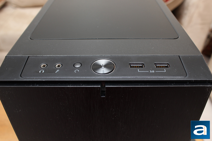 At the top of the case, we have a grid of various inputs and outputs. From left to right, we have two 3.5mm audio jacks; one for headphones and one for a microphone. Next to it is a small reset button. In the middle is a large power button with quite a bit of actuation travel. In fact, I was almost surprised how far you have to press into the button to activate it. Finally, we have two USB 3.0 ports. While they are not marked with the standard blue connections you see on other cases, I can assure you these are USB 3.0. Underneath these ports is a small plastic divot, which is where the LED power indicator is located. Finally, at the top, you can see Fractal Design's ModuVent system. This single plastic piece allows users to either pop it off when used for cooling intake, or to keep it on for a quieter system. The ModuVent also has another layer of their sound insulation material behind for more noise suppression