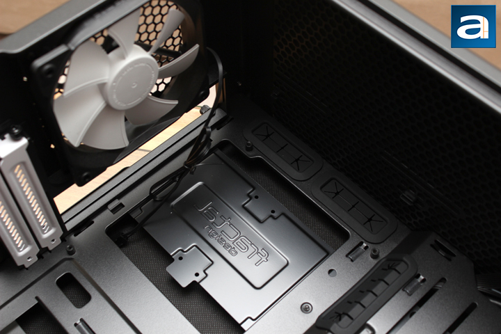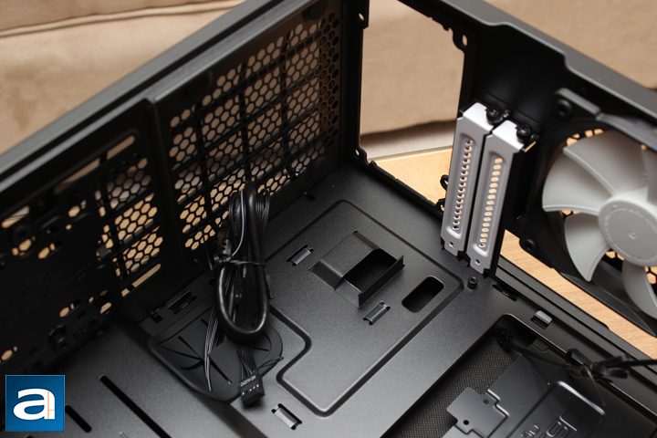 The entire bottom is ventilated, again helping with airflow out of the power supply and the rest of the case. The bottom of the case could hold a 120mm fan, but it is limited by the power supply length and removable bracket. The bracket is intended to let users mount a water cooler pump and reservoir at the bottom. This being said, most users using liquid cooling will probably find the pump and reservoir mounting option more useful than a fan.