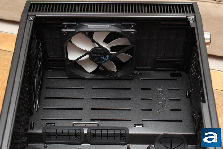 At the front, we have a single 140mm Fractal Design Dynamic GP-14. This fan is rated at 1000 RPM, airflow of 68.4 CFM, and maximum air pressure of 0.71mm H2O. As mentioned previously, up to a maximum of two 140mm fans or a single 280mm radiator can be placed here. However, this is with a caveat. The front area only has rows of large slits in the front, and this is to possibly place storage drives or other water cooling components using the bottom mounting sled. However, with the fan mounted on the inside of the case, 3.5" drives will interfere with either the front fans, the top fans, or the routing holes, depending on the mounting location. Thus you can see there are some compromises to get everything fitted into such a small chassis, but the physical limitations are understandable. In addition, there is still a sense of modularity, even if at the expense of other components. Once again, it is good to see the routing holes having their proper rubber grommets.
