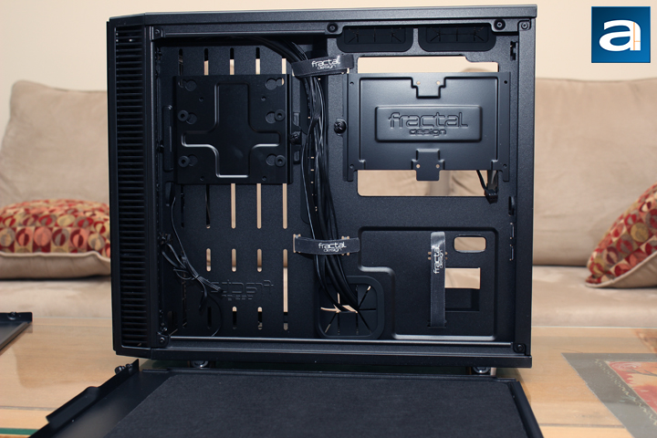 Looking at the back of the Fractal Design Define Nano S, and we have a pretty standard picture here. Much like the rest of the case, the back is a similar layout to the Define S. We have two sections separated by the cabling holes in the center. To the left of these holes we have another bracket, used for mounting 3.5" and 2.5" storage drives and accessories. Your drive would screw into a plate, and the whole plate will be mounted onto this area, attached with a fixed thumbscrew. This area is also used to put most of your excess cabling, as we have approximately 35mm in room between the frame and sliding panel. In the middle are all the cabling holes with rubber grommets. There are also three Velcro straps that go in the standard routing areas, used to keep all the loose cables tidy and stopping them from flying around. Finally, to the right of the divide, we have two things to note. One is the fact this area is shallower for cabling, as only 17mm of gap is provided. Secondly, we have the dual 2.5" drive trays, located at the back of the motherboard tray opening. Again, it is held on with a thumbscrew, which stays attached to the sled. As I have mentioned before, the right side panel has Fractal Design's excellent sound dampening material, which makes it a bit heavier, but not by too much.