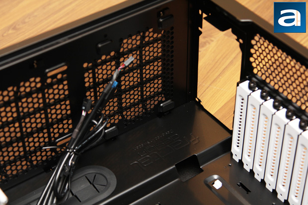 Because the Fractal Design Define R5 features a bottom mounted power supply bay, the chassis platform is raised about a centimeter off the ground to accommodate units with fans at the bottom. Inside the Define R5, metal bumps with foam toppings at the top elevates the power supply up a further half centimeter, just to ensure enough air is made available to your PSU. A thin layer of foam further dampens any vibrations caused by your power supply against your chassis back panel. The honeycomb grille has an externally removable dust filter pre-installed, so you will not need to worry about nasty stuff clogging your fans down the road. A large opening for routing your PSU cables is appropriately placed adjacent to the expected location of your power supply, as shown in our photo above. As always, a rubber grommet is present to keep everything looking neat and tidy.