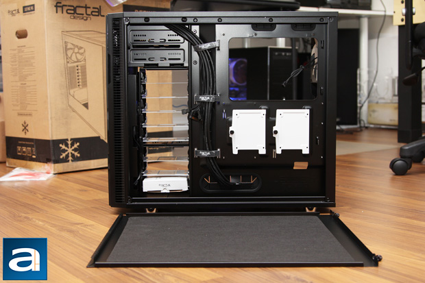 One bottom 120mm or 140mm fan can be installed into the Define R5. Should you need more, you can remove the bottom 3.5" drive rack to accommodate one more 120mm or 140mm fan. With no bottom fans installed, Fractal Design claims the Define R5 can take power supplies up to 300mm long. Of course, this is just a trivial fact, because I do not believe something of such a size exists in the world, haha.